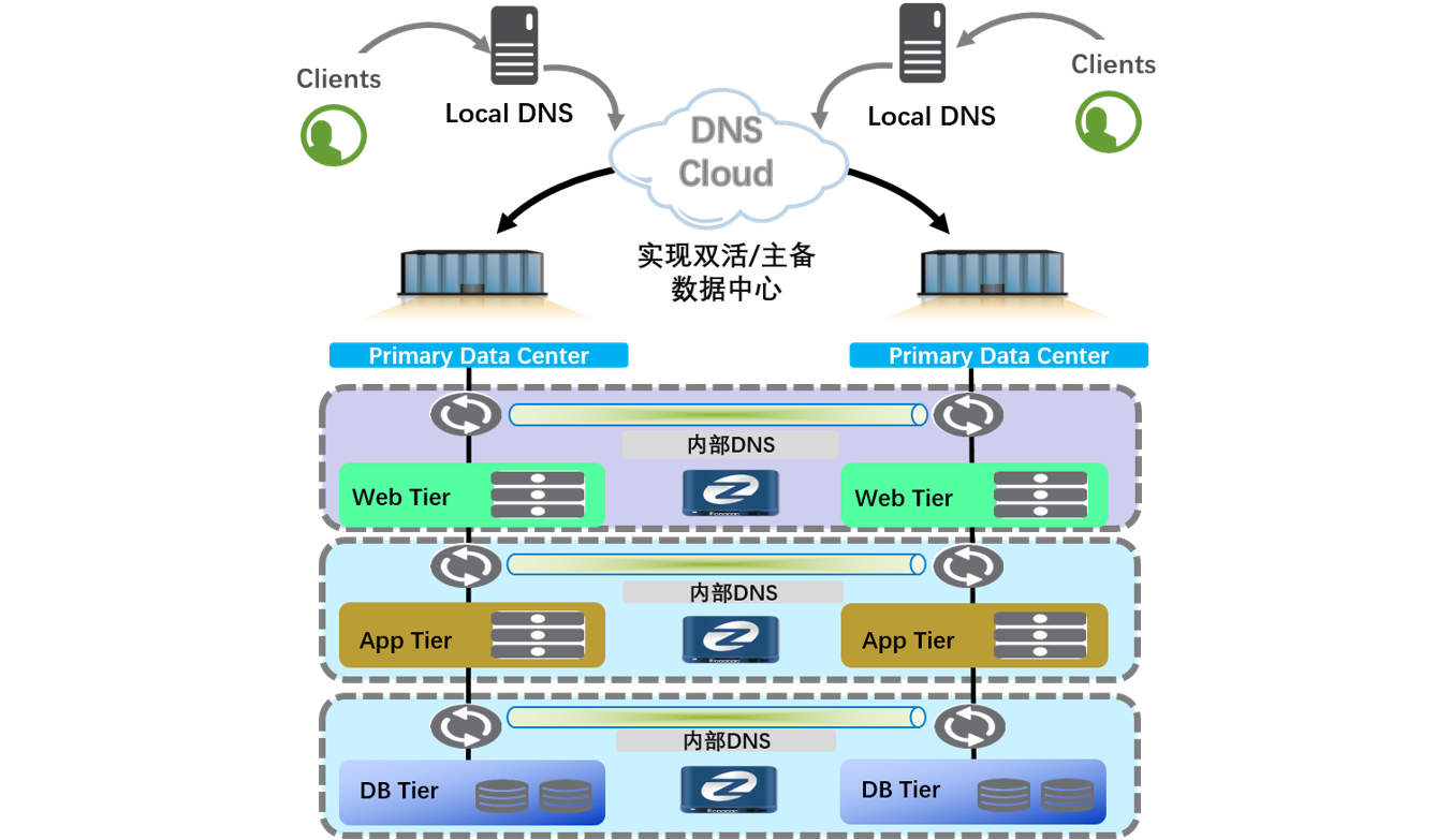 数据中心为提高应用系统的可靠性,实现多站点资源分布式部署,提高资源的利用率,需要多站点的应用系统构建成多活或主备工作模式。为了与IP地址解耦,通常会使用域名系统(DNS)来调度这些应用。一竞技官网多数据中心域名(DNS)解决方案以IT整体架构为蓝图,以业务陆续在性保障为目标,利用域名解析门户应用调度功能,可将用户访问流量引流到可靠、可用的数据中心进行访问,既能保证用户的使用体验,又能达到应用容灾的无感切换的目的。